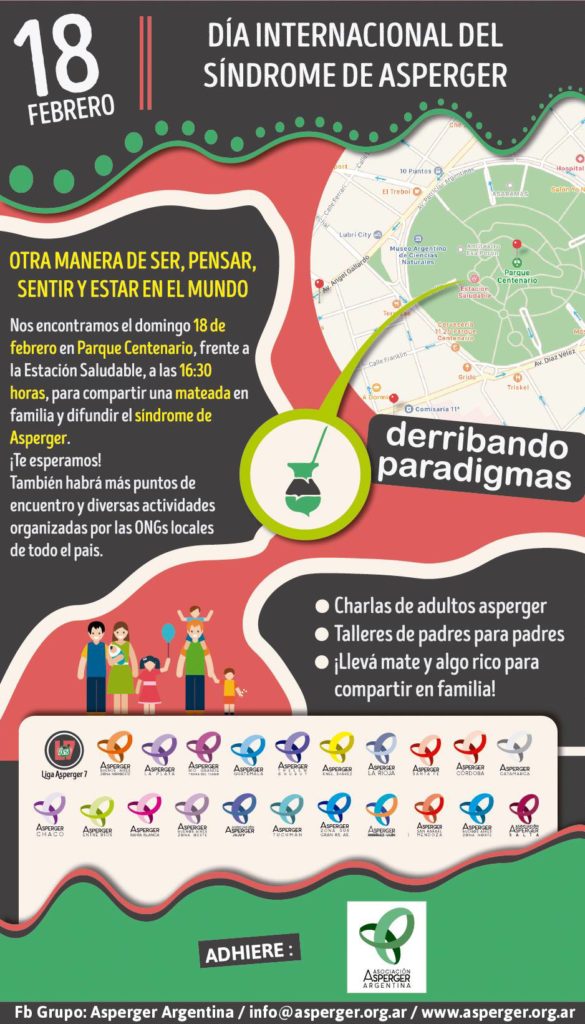 El domingo 18 de febrero a las 16:30 hs nos encontramos en el Parque Centenario (frente a la Estación Saludable) para compartir una mateada en familia y difundir el Síndrome de Asperger.
