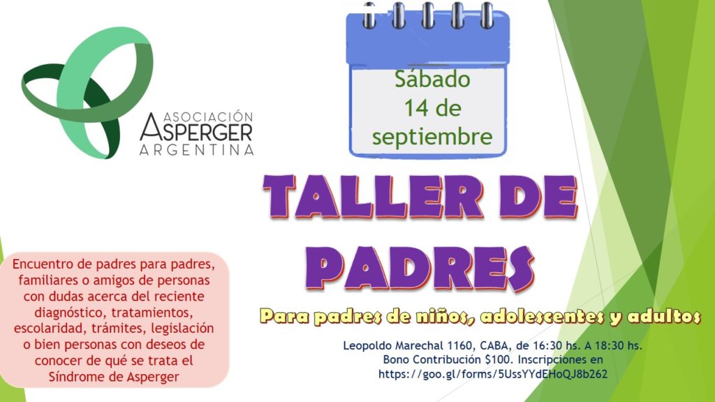 Plano para llegar: https://goo.gl/maps/EWVVjXMCrYnEncuentro de padres para padres, familiares o amigos de personas con dudas acerca del reciente diagnóstico, tratamientos, escolaridad, trámites, legislación o bien personas que tengan deseos de conocer de qué se trata el Síndrome de Asperger.También invitamos a sus hijos: niños, adolescentes y jóvenes adultos, de 13 a 30 años, a participar de nuestros Talleres Recreativos, enviando un mail a grupos@asperger.org.ar para combinar su participación y que puedan compartir un encuentro gratuito.Informes:
